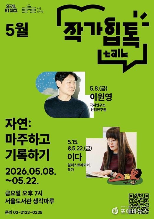 서울도서관에서는 ‘자연: 마주하고 기록하기’를 주제로 ▲극지연구소 이원영 선임연구원의 ‘극한에서 살아남은 생명들의 이야기’ ▲주변 자연환경을 관찰해 글과 그림으로 기록하는 이다 작가의 ‘도심 속 자연 관찰일기 워크숍(2회)’이 진행될 예정이다. 자치구 공공도서관에서도 ▲『그래서 우리는 도서관에 간다』 이권우 작가 초청 강연(마포중앙도서관) ▲『재즈가 낯선 당신에게』 김효진 작가 인문학 공연(광진정보도서관) ▲『기억의 집』 이혜리 작가와의 그림책 창작 이야기(선유도서관) 등 다양한 프로그램이 마련된다.