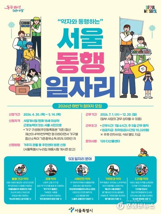 참여를 희망하는 시민은 5월 14일까지 주소지 동주민센터에서 상담 및 신청이 가능하다. 대상은 18세 이상 서울시민으로, 가구원 합산 중위소득 85% 이하이면서 합산재산 4억 9,900만 원 이하인 경우 신청할 수 있다. 최종 선발된 참여자는 1일 6시간, 주 5일 근무하며 일급은 62,000원 수준으로 월 평균 세전 약 180만 원을 받는다.