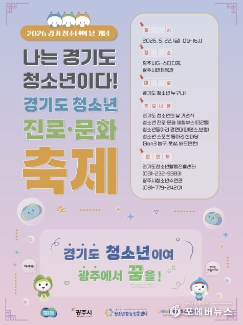 [ 포에버뉴스 김경순 기자 ] 광주시는 오는 5월 22일 광주시 G-스타디움 및 광주시민체육관 일원에서 ‘2026년 경기도 청소년 진로·문화 축제’를 개최한다고 29일 밝혔다.