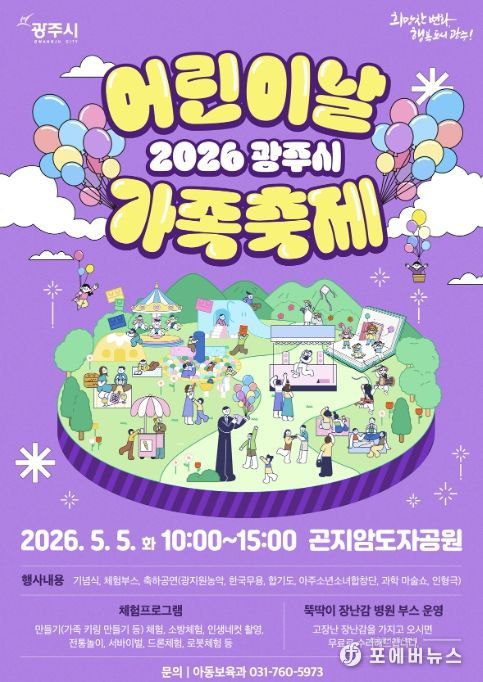 시 관계자는 “어린이날 가족축제가 아이들에게 꿈과 희망을 키우는 특별한 하루가 되고 가족 모두에게 소중한 추억이 되길 바란다”며 “앞으로도 어린이들이 건강하고 행복하게 성장할 수 있는 환경을 조성해 아동친화도시 광주시를 만들어 나가겠다”고 말했다.