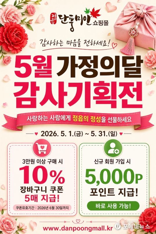 [ 포에버뉴스 사공선 기자 ] 정읍시가 다가오는 5월 가정의 달을 맞아 시민과 전국 소비자에게 감사의 마음을 전하고 지역 우수 농특산물 소비를 활성화하기 위해 ‘단풍미인쇼핑몰 5월 가정의 달 기획전’을 운영한다.