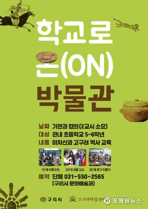 [ 포에버뉴스 김경순 기자 ] 구리시는 4월 28일부터 오는 9월까지 고구려 유물 상자를 들고 관내 초등학교를 찾아가는 ‘학교로 온(ON) 박물관’프로그램을 운영한다고 밝혔다.