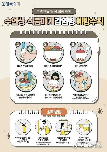 주요 예방수칙은 ▲흐르는 물에 비누로 30초 이상 손 씻기 ▲음식은 충분히 익혀 먹기 ▲물은 끓여 마시기 ▲채소와 과일은 깨끗이 씻어 섭취하기 ▲설사 증상 시 음식 조리 금지 ▲조리기구 구분 사용 등이다.