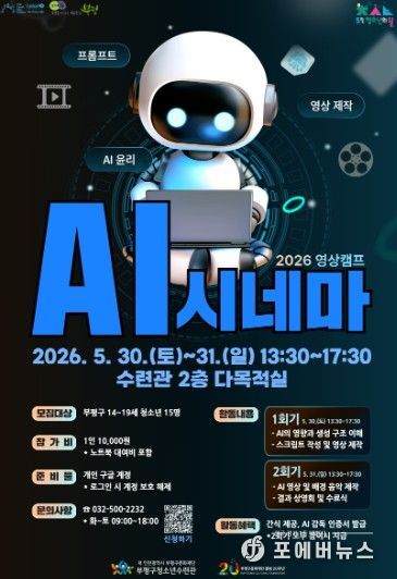 [ 포에버뉴스 김경순 기자 ] 부평구청소년수련관은 오는 5월 30일부터 31일까지 진행하는 ‘2026 영상캠프 AI 시네마’ 참가자를 모집한다고 밝혔다.