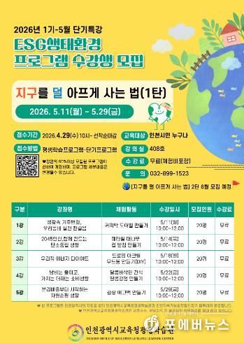 [ 포에버뉴스 김경순 기자 ] 인천광역시교육청평생학습관은 4월 29일부터 인천시민을 대상으로 '지구를 덜 아프게 사는 법' ESG 생태환경 프로그램 1기 수강생을 모집한다.
