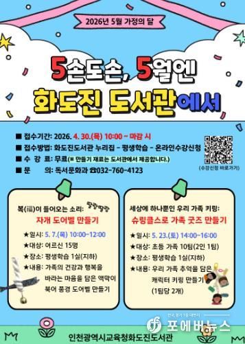 [ 포에버뉴스 김경순 기자 ] 인천광역시교육청화도진도서관은 5월 가정의 달을 맞아 유·초등생 동반 가족과 어르신을 대상으로 세대 맞춤형 프로그램 ‘5손도손, 5월엔 화도진도서관에서’를 운영한다.