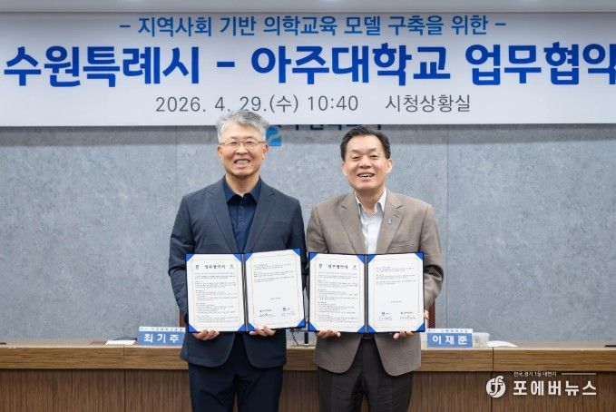 수원시와 아주대학교는 29일 시청 상황실에서 ‘지역사회 기반 의학교육 모델 구축을 위한 업무협약’을 체결하고 협력을 약속했다.
