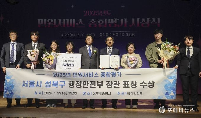 [ 포에버뉴스 김경순 기자 ] 서울 성북구가 행정안전부와 국민권익위원회가 공동 주관한 ‘2025년 민원서비스 종합평가’에서 행정안전부 장관 표창을 수상하며 민원행정 우수 지자체로서의 위상을 다시 한 번 확인했다.