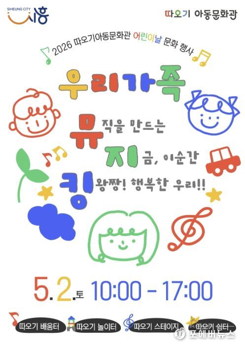 [ 포에버뉴스 김경순 기자 ] 시흥시 따오기아동문화관은 어린이날을 맞아 오는 5월 2일 오전 10시부터 오후 5시까지 따오기아동문화관 야외 일대에서 2026년 어린이날 문화행사 ‘우리가족 뮤지킹’을 개최한다.