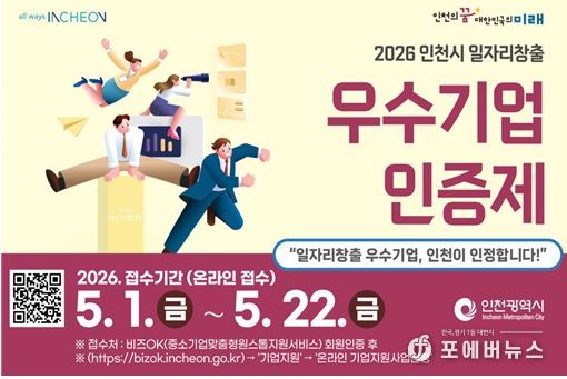 [ 포에버뉴스 김경순 기자 ] 인천광역시는 고용 창출뿐만 아니라 근로환경 개선까지 종합적으로 평가하는 ‘2026년 일자리창출 우수기업 인증제’를 시행한다고 밝혔다.