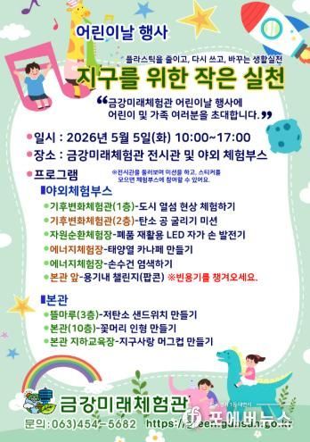 [ 포에버뉴스 이승훈 기자 ] 군산시 금강미래체험관이 어린이날을 맞아 5월 5일 오전 10시부터 오후 5시까지 체험관 전시관과 야외 체험부스 일원에서 어린이 및 가족 단위 관람객을 대상으로 어린이날 기념 환경체험 프로그램 ‘지구를 위한 작은 실천’을 운영한다.