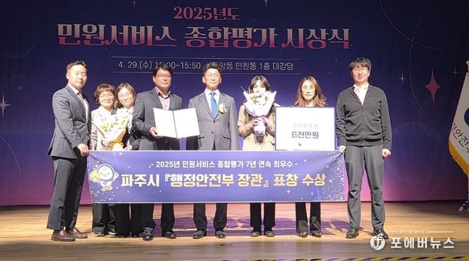 [ 포에버뉴스 김경순 기자 ] 파주시는 지난 29일 정부세종청사 대강당에서 열린 녩년 민원서비스 종합평가’시상식에서 행정안전부 장관 표창을 수상하고, 시상금으로 특별교부세 6천만 원을 확보했다.