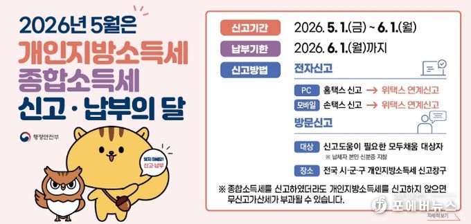 종합소득세는 2025년에 발생한 사업소득, 근로소득, 이자·배당소득, 연금소득, 기타소득 등을 합산해 신고하는 세금이다. 개인지방소득세는 종합소득세의 10%에 해당하는 지방세로, 종합소득세 신고와 함께 5월 1일부터 6월 1일까지 신고·납부해야 한다.