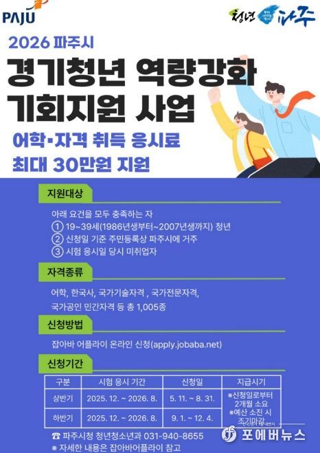 [ 포에버뉴스 김경순 기자 ] 파주시는 청년들의 취업 준비 비용 부담을 낮추고 고른 취업 기회 제공을 위해, 미취업 청년에게 어학·자격시험 응시료를 최대 30만 원까지 지원하는 ‘경기청년 역량강화 기회지원’사업을 추진한다.