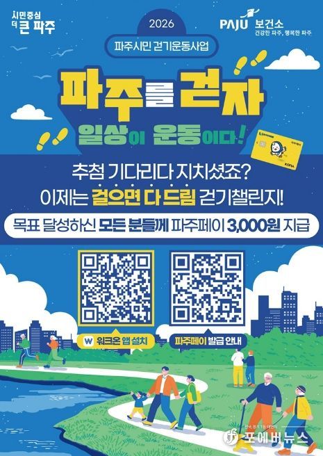 이번 개편의 핵심은 기존 ‘추첨 방식’을 폐지하고, 목표 달성자 전원에게 특전을 지급하는 방식으로 전환한 것이다. 이에 따라 시민들은 더 이상 당첨 여부를 기다릴 필요 없이 정해진 걸음 수 달성과 함께 다양한 미션을 수행하면 누구나 파주페이 3천 원을 받을 수 있어, 걷기 실천에 대한 참여 문턱이 크게 낮아질 전망이다.