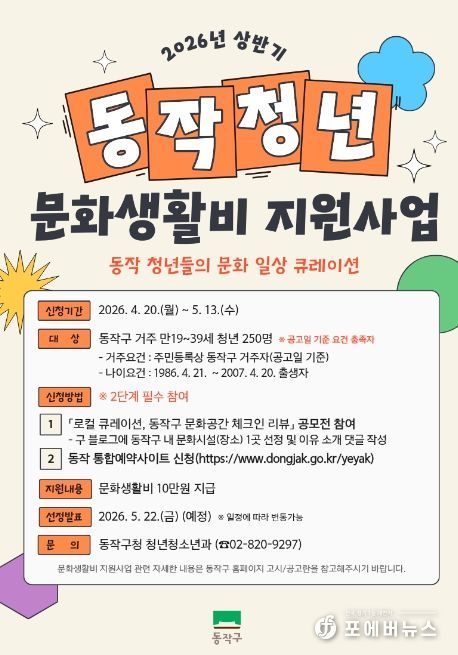 박일하 동작구청장은 “이번 공모를 통해 청년들이 지역의 문화공간을 직접 경험하고, 지원을 바탕으로 다양한 문화생활을 이어가는 계기가 되길 바란다”며, “앞으로도 청년들이 부담 없이 문화생활을 누릴 수 있도록 체감도 높은 문화 정책을 지속적으로 추진하겠다”고 말했다.
