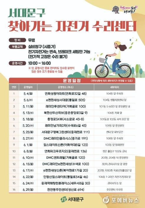 [ 포에버뉴스 김경순 기자 ] 서대문구가 주민들의 자전거 이용 활성화와 안전한 운행을 위해 5∼6월과 9∼11월 ‘찾아가는 자전거 수리센터’를 총 32회 운영한다.