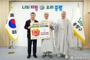 [ 포에버뉴스 김경순 기자 ] 중랑구가 지난 6 일 오후 구청장실에서 사단법인 나누며하나되기와 함께 ‘ 취약계층 행복나눔 물품 전달식 ’ 을 진행했다 . 이번 전달식에서 대한불교천태종 산하 사단법인 나누며하나되기는 겨울철 추위와 경제적 어려움을 겪고 있는 지역 내 취약계층과 어린이들을 위해 5,000만 원 상당의 건강·생활·방역용품을 기탁했다. 기탁된 성품은 도움이 필요한 가정에 순차적으로 전달될 예정이다. 사단법인 나누며하나되기는 2003년 창립 이후 국내외에서 다양한 구호 활동을 이어오고 있으며, 중랑구와는 이번이 세 번째 나눔이다. 현재까지 중랑구에 전달한 성품의 누적 가액은 약 1억 원에 이른다. 류경기 중랑구청장은 “지역사회를 위해 꾸준히 따뜻한 나눔을 실천해 주셔서 감사드린다”라며 “기탁받은 성품은 도움이 필요한 이웃들에게 정성껏 전달해 모두가 온기를 느낄 수 있는 겨울이 되도록 하겠다”라고 말했다.