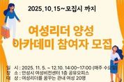 [ 포에버뉴스 김경순 기자 ] 안성시는 지역사회 발전을 이끌 열정있고 능력있는 여성 지도자를 발굴·육성하기 위해 ‘2025년 안성시 여성리더 양성 아카데미’ 기본과정 교육 참가자를 모집한다. 이번 아카데미는 적극적으로 참여할 수 있는 여성 시민 누구나 신청할 수 있으며, 신청기간은 오는 10월 15일부터 시작된다. 교육은 11월 5일부터 12월 10일까지 6주간 매주 수요일에 안성시여성비전센터 (발화대길 25) 1층 공유오피스에서 진행 될 계획이다. 교육 내용은 ‘나는 당신이 행복했으면 좋겠습니다.’ 라는 주제로 김경희 강사의 행복소통 리더십 강의로 개강식을 열고 2~3주차는 감성을 담아 나를 알리는 SNS 활용법 이론편과 실습편, 4~5주차에는 나만의 비서 만들기 챗봇과 생성형 AI교육 이론편과 실습편을 구성하여 최신 트렌드에 맞춘 리더 역량 강화를 위한 강의들로 구성했으며 6주차에는 퍼실리테이션 기법을 활용하여 지역 내 현안 문제를 파악하고 리더로서 해결 방법을 제시하는 과정을 마지막으로 수료식을 가질 예정이다.