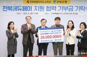 [ 포에버뉴스 이승훈 기자 ] 전북에듀페이카드 운영사인 전북은행이 전북특별자치도교육청에 장학금 2,600만 원을 기부했다. 전북교육청과 전북은행은 25일 본청 5층 회의실에서 전북에듀페이 지원 협력사업 기부금 기탁식을 개최했다. 전북은행은 이날 전북에듀페이카드 바우처 사용액의 0.1%에 해당하는 2,600만 원의 기부금을 학생 복지와 지역사회 공헌의 취지로 기탁했다. 지난해 2,000만 원을 기부한 전북은행은 내년까지 3년 동안 약 6,300만 원을 기부할 계획이다. 전북은행 기부금은 전북특별자치도교육청사랑의장학회를 통해 장학금으로 전달된다. 올해 초중고 학생과 학교 밖 청소년 등 총 16만3,000여 명에게 238억여 원의 전북에듀페이를 지원하기로 한 전북교육청은 이달 24일부터 다음 달 15일까지 집중신청 기간을 운영하고 있다. 김은호 전북은행 부행장은 “전북에듀페이카드 운영사로서 전북에듀페이를 매개로 나눔과 베풂의 학생 교육복지에 동참할 수 있어 뜻깊게 생각한다”고 밝혔다. 한긍수 정책국장은 “전북에듀페이가 단순한 지원금을 넘어 교육과 나눔이 공존하는