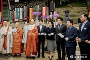 [ 포에버뉴스 김경순 기자 ] 남양주시의회는 9일 남양주시 진접읍 봉선사 큰법당에서 열린 1056주년 개산대제 및 운허체 배포식에 참석했다. 운허체는 운허스님이 생전에 직접 쓰신 발원문의 육필을 토대로 남양주시와 봉선사가 함께 운허스님의 가르침과 정신을 현대적으로 계승하기 위해 개발했으며, 한글 2,350자와 특수문자 451자가 붓글씨체 폰트로 제작됐다. 이날 행사는 매년 진행되는 봉선사 개산대제와 더불어 한글날을 맞아 진행한 운허체 배포식으로 특별한 의미를 더했으며, 조성대 남양주시의회 의장을 비롯해 이정애 부의장, 이경숙 복지환경위원장, 김지훈(국) 의원, 김동훈 의원, 이수련 의원, 김상수 의원 및 홍지선 부시장, 국회의원 및 도의원, 불자와 시민 등 500여명이 참석한 가운데 개최됐다. 먼저, 개산대제 행사는 부전스님의 명종을 시작으로 △개회선언 △삼귀의례 △우리말반야심경 순으로 진행됐으며, 이후 열린 운허체 배포식은 △제작 경과보고 △발원문 현수막 제막 △봉선사 주지 호산스님의 봉행사 △두산일면 대종사, 여산암도 대종사의 치사 △축사 순으로 진행됐다. 조성대 의장은 축사를 통해“불교의
