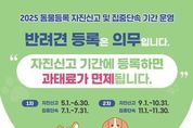 [ 포에버뉴스 김경순 기자 ] 양천구는 반려동물의 유실·유기 방지와 체계적인 관리 강화를 위해 오는 10월 31일까지 ‘동물등록 자진신고 기간’을 운영한다고 9일 밝혔다. 현행 동물보호법에 따르면 2개월령 이상의 반려견은 의무적으로 동물등록 대상이며, 소유자 정보나 동물의 상태가 변경(유실, 되찾음, 사망 등)된 경우에도 반드시 변경 신고를 해야 한다. 구는 소유자의 자발적 동물등록을 유도하고 등록 미비로 발생하는 각종 문제를 사전에 차단하기 위해 자진신고 기간을 운영하고 있으며, 이 기간에 신규 등록하거나 변경사항을 신고하면 미등록·미신고에 따른 과태료를 면제하고 있다. 동물등록은 구에서 대행기관으로 지정한 동물병원을 방문해 진행하면 된다. 등록 방식은 마이크로칩을 피하에 삽입하는 내장형과 목걸이 형태로 부착하는 외장형 중 선택할 수 있다. 변경 신고는 동물등록 대행기관을 통해 접수하거나, ‘정부24’ 또는 ‘국가동물보호정보시스템’에서 온라인으로도 가능하다. 구는 특히 내장형 동물등록을 진행한 소유주에게 동물등록비도 지원하고 있다. 올해는 총 250마리를 대상으로 지원하며, 동물등록 대행기관에서